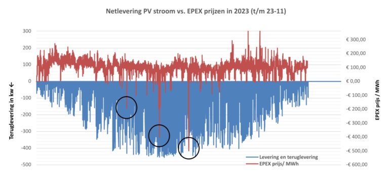 Op de elektriciteitsmarkt doet een duidelijke trend zich voor: we krijgen steeds vaker te maken met negatieve elektriciteitsprijzen. Maar wat is nu de impact op de inkomsten van jouw PV systeem? Om deze vraag te kunnen beantwoorden hebben we gekeken naar ons enige PV systeem waarbij we nog geen curtailment toepassen. Op basis van de productiedata en de EPEX-prijzen tot en met 23-11-2023 hebben we berekend hoeveel geld we hebben verloren door stroom te leveren tegen negatieve prijzen.